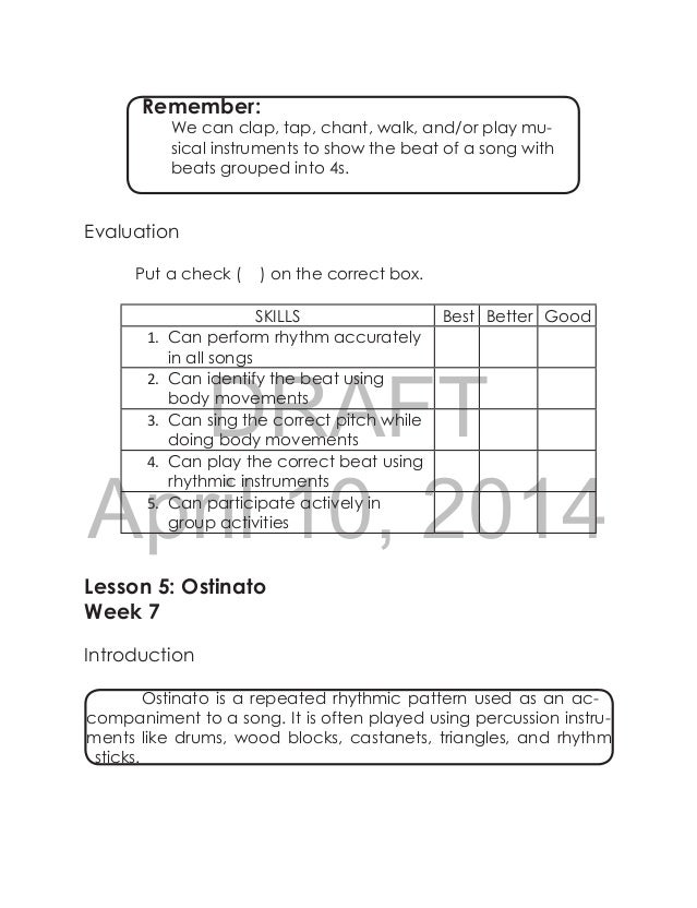 Music: Grade 1 Overall Expectations By the end of Grade 1, * distinguish between beat and rhythm in a simple song; drums, wood blocks, piano). Creative Work * sing music from a variety of cultures and historical periods; ... Read Content